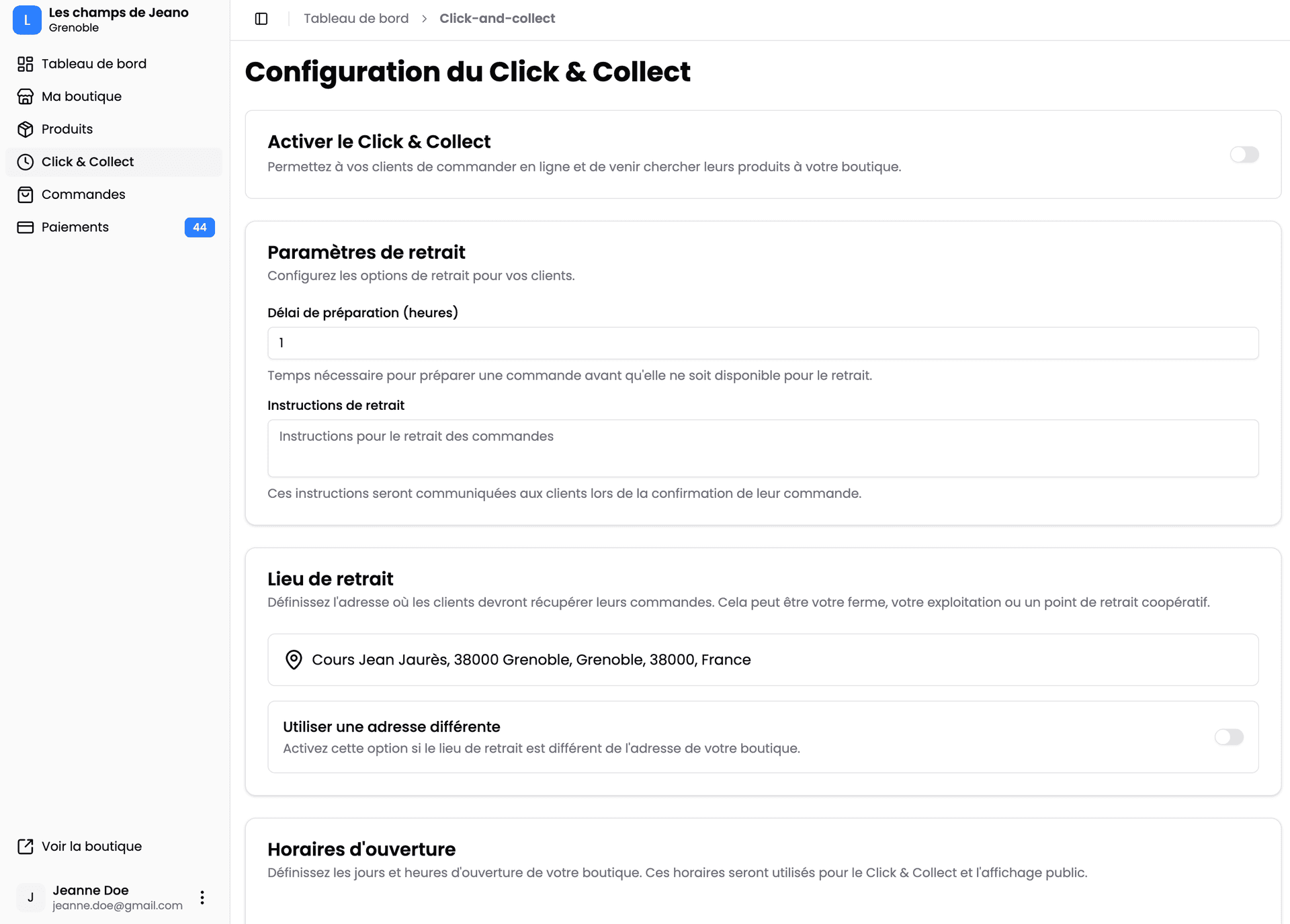 - Définissez vos horaires d'ouverture et votre point de retrait